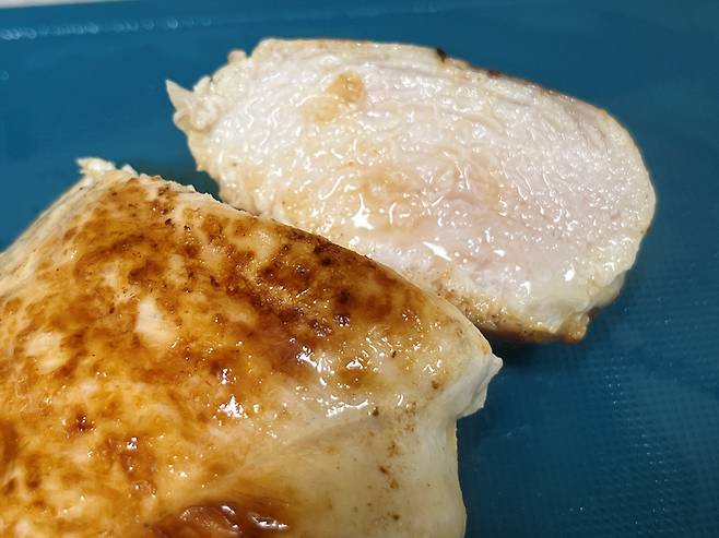 이 방법으로 구웠더니 닭가슴살 속살까지 매우 촉촉하고 육즙을 가득 머금고 있네요. 퍽퍽했던 닭가슴살과는 정말 다른 맛입니다. 닭가슴살 그냥 굽지 마시고 이렇게 구워 보세요!