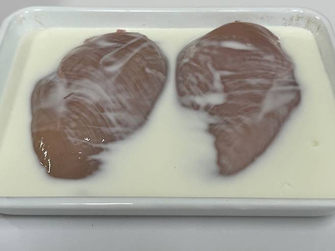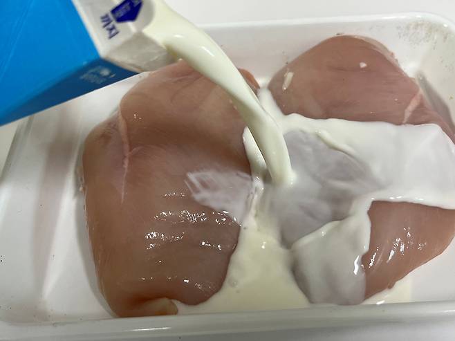 만약 냉장고에 유통기한 지난 우유가 있다면 닭가슴살 굽기 전 잠시 동안 재워 보세요!