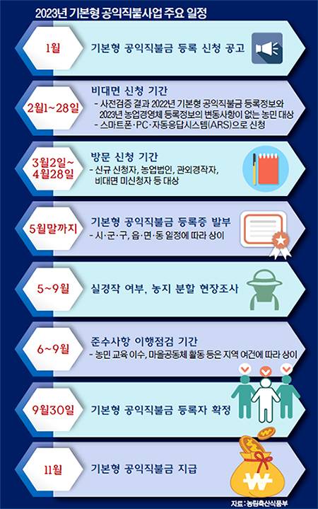 1일부터 2023년 기본형 공익직불금 신청이 시작됐다. 공익직불제는 사각지대 해소를 위해 지급 대상을 확대하고 자동응답시스템(ARS) 신청을 도입하는 등 올해 제도개선을 통해 새로운 전기를 맞게 됐다. 정부는 이와 함께 공익직불제 추진체계 전반의 디지털화로 농민의 편리성을 높이고 부정수급 점검을 강화해 제도에 대한 신뢰도를 끌어올린다는 구상이다.