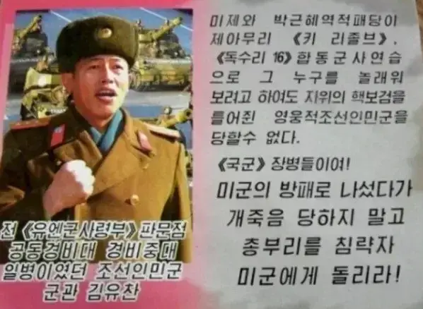 전단 문구에는 “전 유엔군사령부 판문점 공동경비중대 일병이었던 조선인민군 군관 김유찬”이라는 식의 표현이 사용됐다.