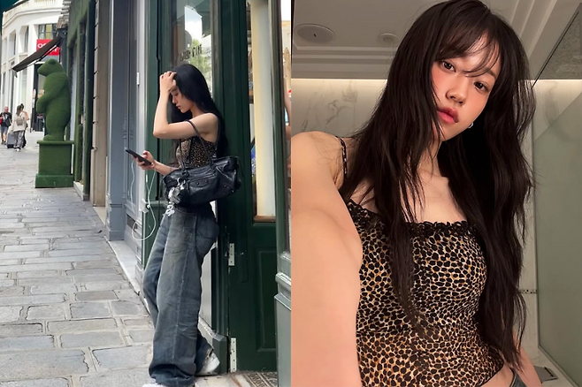노윤서는 첫 번째 스타일링에서 레오파드 슬리브리스 톱과 루즈핏 데님 팬츠를 매치해 자유로운 무드를 표현했다.