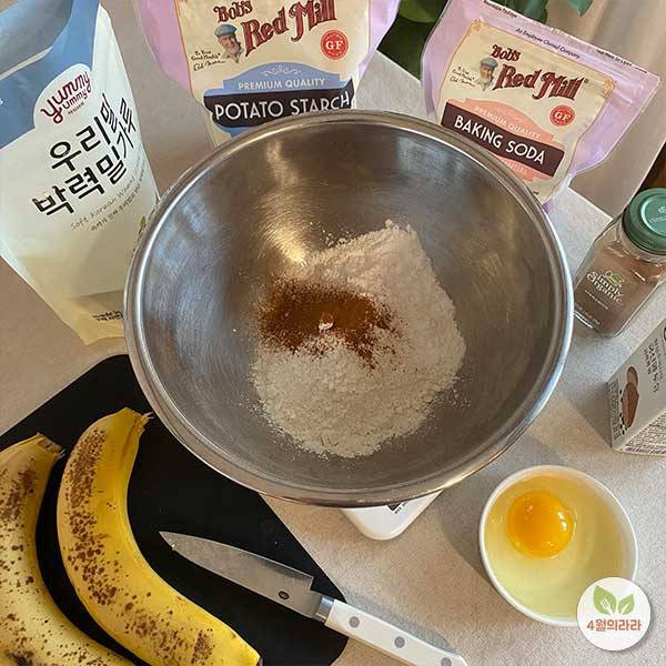 → 볼에 박력분, 감자전분, 베이킹소다, 시나몬가루를 넣어 섞는다.