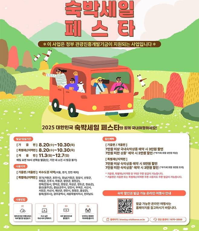 숙박세일페스타는 ‘가을편’과 ‘겨울편’으로 나뉜다. 가을편은 8월 20일부터 10월 30일까지, 겨울편은 11월 3일부터 12월 7일까지 진행되며, 서울·경기·인천을 제외한 전국 비수도권이 대상이다.