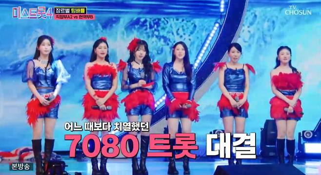 8일 방송된 TV 조선 '미스트롯4' 본선 1차전 장르별 팀 배틀에서 직장부 A2가 현역부 B를 상대로 극적인 승리를 거뒀다.