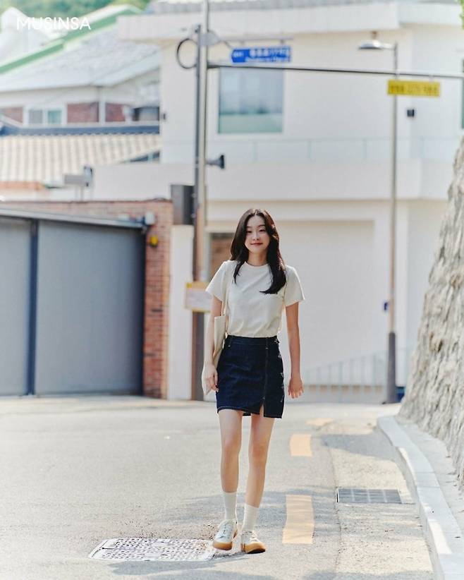김다미는 트레이닝복 차림에도 170cm의 큰 키와 8등신에 가까운 우월한 비율로 시선을 사로잡았습니다.