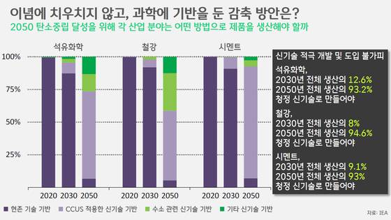 사실 '새로운 성장동력'은 국가나 정부만 찾는 것이 아닙니다. 글로벌 시장에서 살얼음판을 걷고 있는 기업들은 그 누구보다 '제2의 엔진'을 찾으려 혈안이죠. IEA는 2050년 탄소중립 달성을 위한 각 부문별 감축 시나리오를 발표한 바 있습니다. 그럼, 산업부문의 여러 업종 중에서도 온실가스 배출량이 매우 높은 3가지 분야(석유화학, 철강, 시멘트)에 대해 IEA가 제시한 해법은 무엇이었을까요.