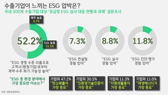CoREi의 설문조사 발표 이틀 전인 7월 18일, 대한상공회의소도 ESG와 관련한 수출기업의 의견을 공개했습니다. 국내 수출기업 300개사를 대상으로 〈수출기업의 공급망 ESG 실사 현황과 과제〉 조사에 나선 결과입니다.
