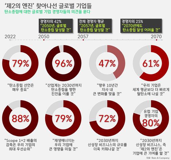 글로벌 컨설팅 기업, 베인앤드컴퍼니는 최근 〈글로벌 에너지 및 천연자원 리포트 2022〉를 펴냈습니다. 이 보고서엔 세계 각지의 글로벌 에너지 및 자원 기업 경영자 1000여명을 대상으로 한 설문조사 결과가 담겼습니다. 그 누구보다 최근의 시장 변화 흐름을 잘 파악하고, 몸소 체험하는 이들에게 에너지전환과 탄소중립에 관한 생각을 물은 겁니다.