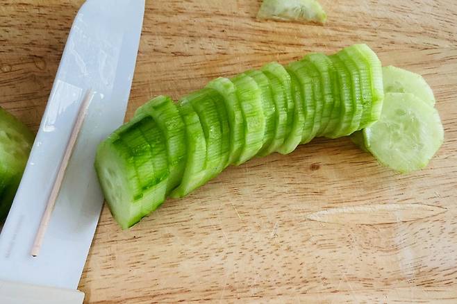이럴 때 칼 등 중앙 부분에 이쑤시개 하나 테이프로 붙여보세요. 야채 써는 내내 달라붙지 않아 정말 편합니다.