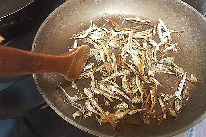 이럴 때 아무것도 두르지 않은 팬에 볶아 주세요. 그러면 다시 바삭해지고 비린내도 날아갑니다.