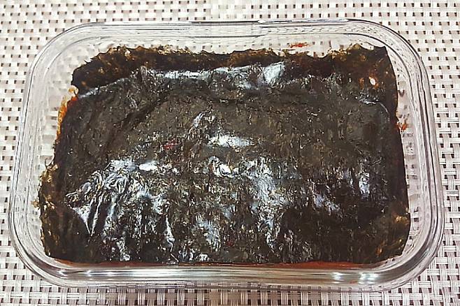 그다음 마른김을 모양에 맞게 썰어 덮어주세요. 그러면 김의 요오드 성분이 곰팡이 생기는 것을 막아줍니다.