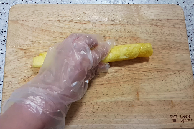 계란 지단 예쁘게 썰고 싶다면 동그랗게 부쳐낸 계란을 위 사진처럼 돌돌돌돌 촘촘하게 말아주시고요