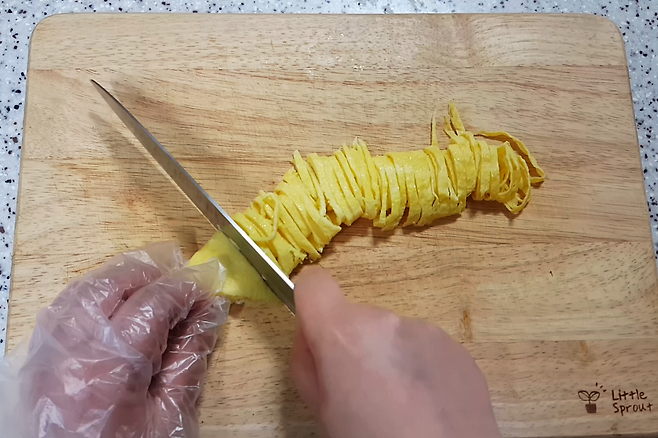 칼로 균일하게 썰어주면 가늘고 모양도 예쁜 지단을 만들 수 있습니다.