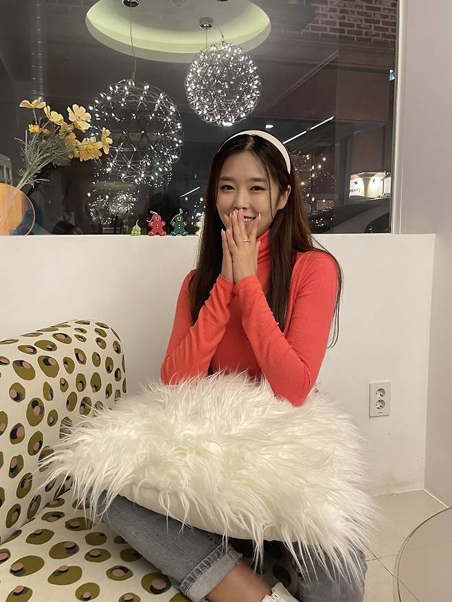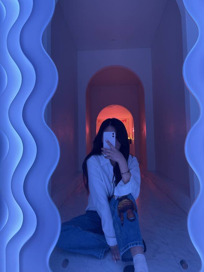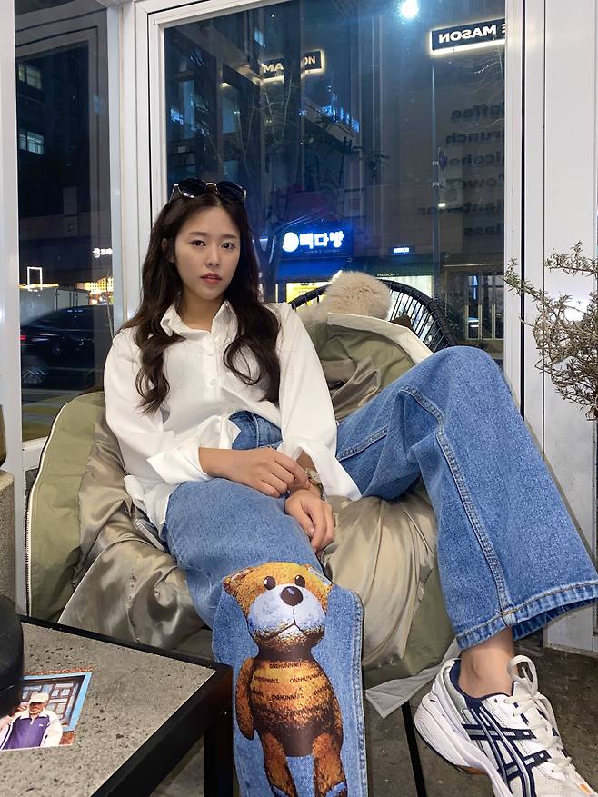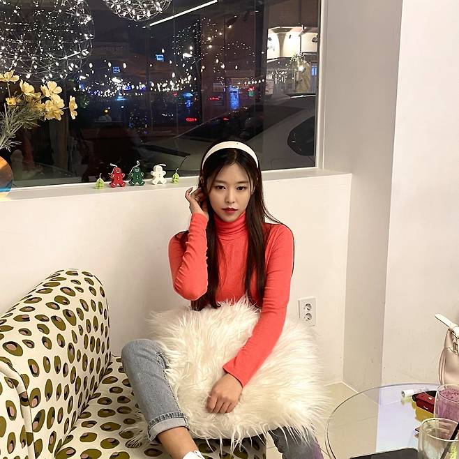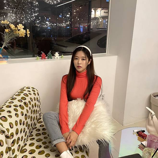 다른 포인트 없이 상의 색만으로도 충분히 포인트가 되는 룩이에요
