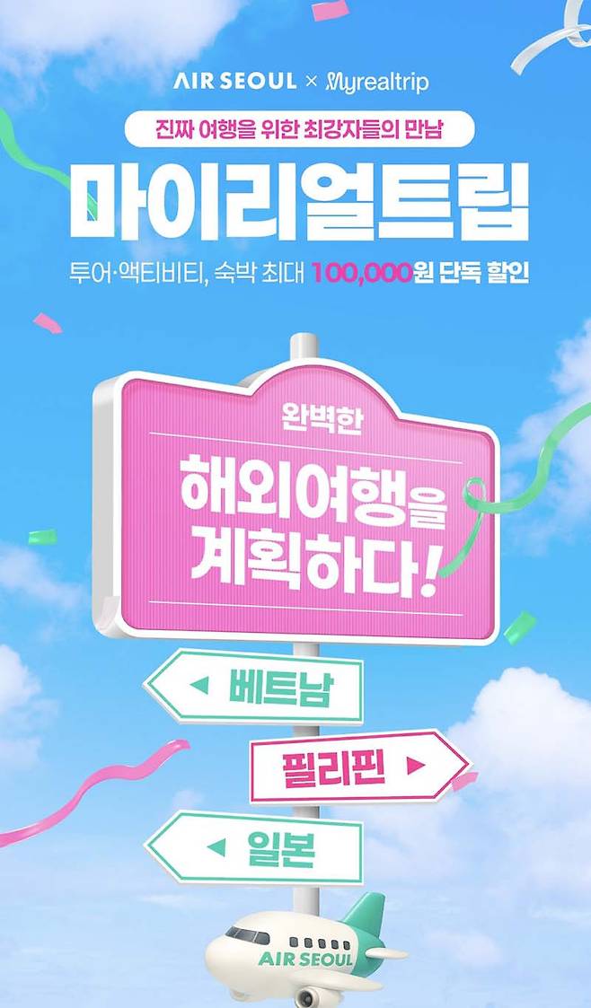 [M포스트 구기성 기자] 에어서울이 국제선을 대상으로 이달 31일까지 마이리얼트립과 제휴 프로모션을 시행한다고 18일 밝혔다.