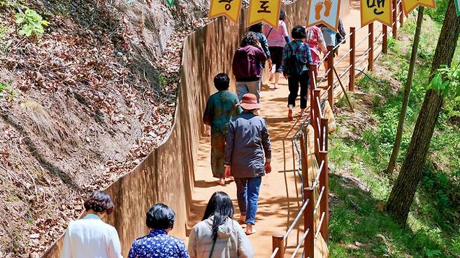 조성된 보행로는 마사토와 황토를 혼합한 흙길로, 맨발로 걷기에 적합한 쿠션감과 촉감을 제공한다. 또한 발을 씻을 수 있도록 세족장을 설치하고, 황토볼을 활용한 체험 공간도 마련하는 등 이용자의 편의를 세심하게 고려했다.