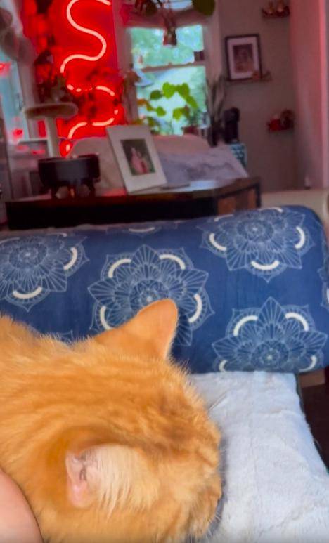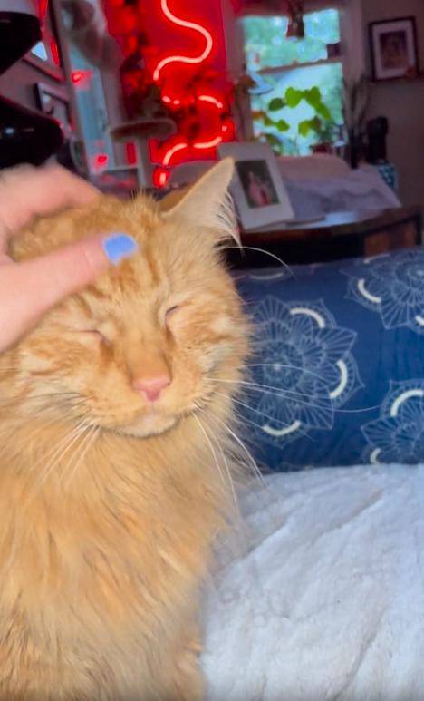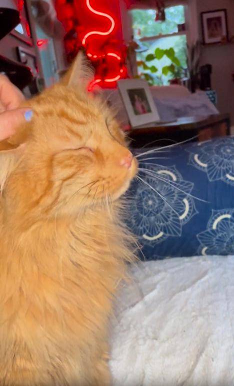 영상은 푹신한 침대 위에서 시작됩니다. 그 위엔 따뜻한 오렌지빛 털을 가진 고양이 한 마리가 조용히 앉아 있죠. 눈을 반쯤 감은 채 고요한 분위기를 즐기고 있는 듯한 모습입니다. 그런데 곧 주인의 손이 다가와 조심스레 고양이의 머리를 쓰다듬습니다.