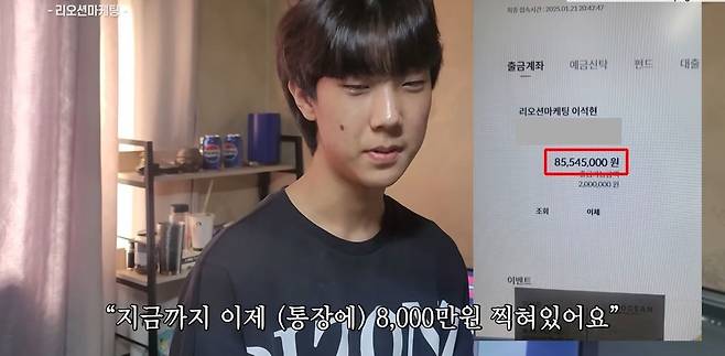 지금 한 달에 수익이 한 750만 원 정도 되는데 제가 딱히 밖에 나가는 걸 안 좋아해서 쓰는 돈은 거의 없어요. 거의 안 놀고 일만 해요. 지금까지 모은 돈이 8,000만 원 찍혀 있어요.