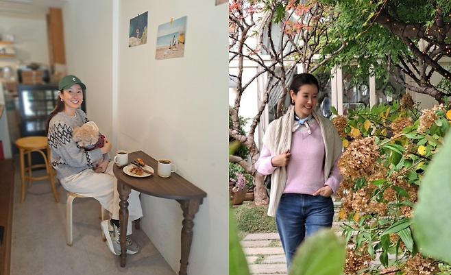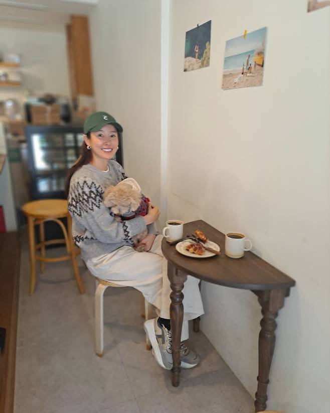 실내 카페에서 이태란은 그레이 바탕에 블랙 패턴이 돋보이는 니트 스웨터와 아이보리 와이드 팬츠를 매치해 포근한 분위기를 자아내고 있다. 그린 캡과 함께 연출한 이 룩은 카페의 아늑한 인테리어와 조화를 이루며 편안하면서도 스타일리시한 느낌을 준다. 특히 품에 안고 있는 반려동물과 함께한 모습이 더욱 친근한 매력을 발산하고 있다. 테이블 위 커피와 간식과 함께 일상 속 여유를 즐기는 모습에서 자연스러운 패션 감각이 돋보인다.