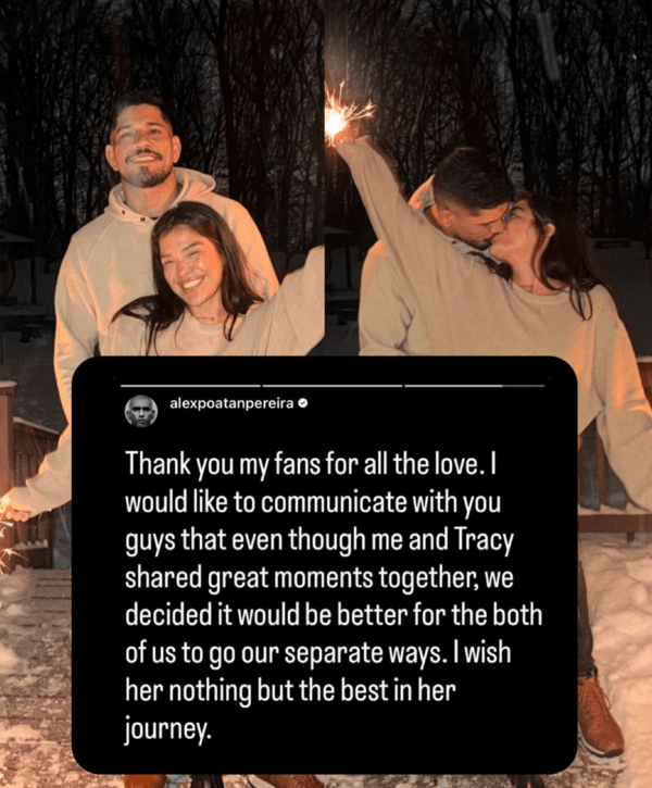 'UFC 라이트 헤비급 챔피언' 알렉스 페레이라는 9일(이하 한국시간) 자신의 사회관계망서비스(SNS)를 통해 트레이시 코르테스와의 결별 소식을 알렸다.