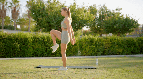 바닥에 서서 시작한 뒤 손은 가슴 앞에 모아 몸의 중심을 잡습니다. 한쪽 다리를 뒤로 뻗으며 무릎을 바닥 쪽으로 구부렸다가, 다시 제자리로 돌아오면서 무릎을 들어 올리고 손은 내려줍니다. 같은 동작을 반복한 뒤 반대쪽 다리로 바꿔 진행합니다.