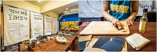 관리법을 배우고 직접 기름을 묻힌 행주로 도마를 닦았습니다. 사포로 한 번 갈아낸 상태라 그런지 도마 표면이 매끄러워 행주가 부드럽게 밀렸습니다. 들기름 냄새도 좋았습니다. 모든 과정이 마치 명상을 하는 기분이었습니다. 박 대표는 “수리는 일상에서 느낄 수 있는 기쁨”이라며 “수리를 마치면 다들 굉장히 행복해하고 물건을 더 소중히 여기게 된다”고 전했습니다.