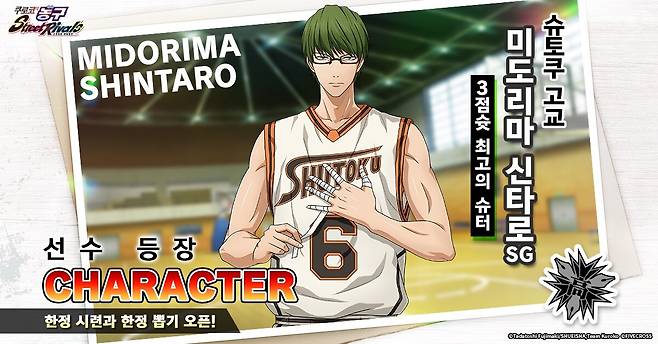 특히 ‘미도리마 신타로’는 원작 애니메이션의 설정 그대로 코트 어디에서라도 3점슛을 던질 수 있는 캐릭터로 방해받지 않으면 반드시 골을 성공시킨다는 새로운 매커니즘을 가진 농구 게임 캐릭터이다. 전방위 3점 슛과 다양한 돌파 스킬로 상대를 제압할 수 있고, 현재 ‘미도리마 신타’로 한정 시련, 카이조 선수 무료 체험, 신인 7일 특훈 등 을 제공하는 인게임 이벤트가 진행 중이다.