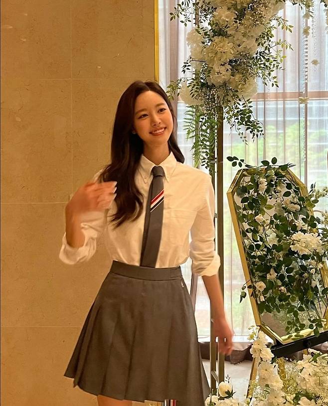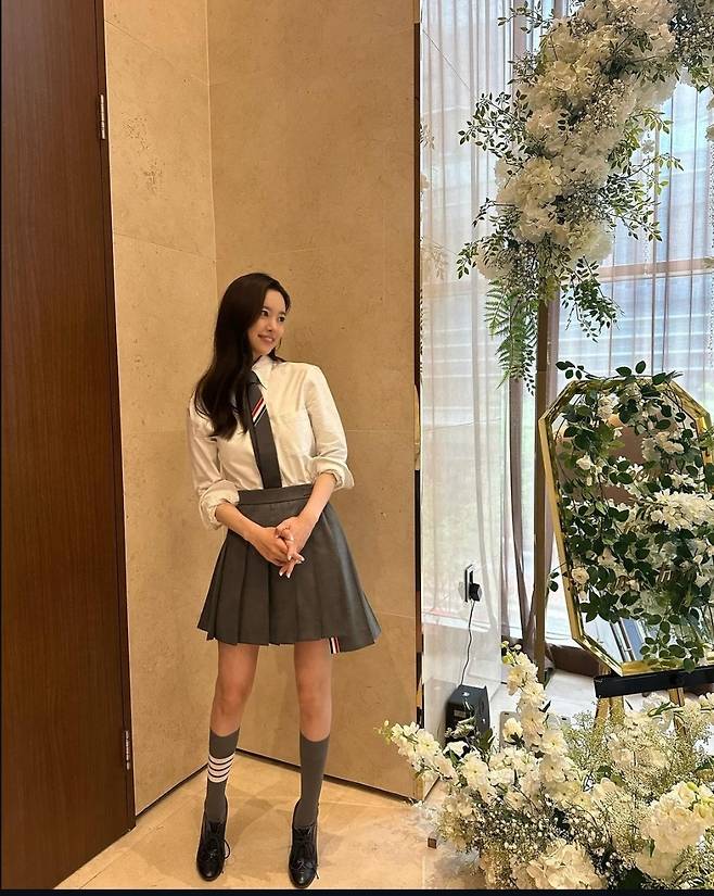 또, 진세연은 회색 플리츠 미니스커트를매치해 귀엽고 사랑스러운 이미지를 연출했습니다.