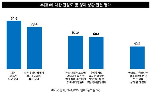 한편 ‘부(富)’에 대한 니즈가 높아지고 있는 것과는 달리, 경제적 수준이 나아질 것이란 기대감은 낮은 모습을 확인할 수 있었다. 전체 응답자의 대다수가 부자가 되고 싶고(90.9%, 동의율), 우리나라에서 중산층으로 살고 싶다(79.4%)는 바람을 내비쳤지만, 지금보다 경제적으로 여유있는 삶을 살게 될 것 같다는 응답은 42.2%에 그친 결과를 보였다.