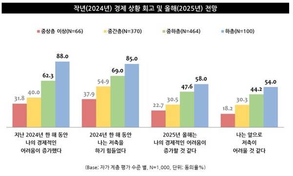 특히 자신의 계층 수준을 낮게 평가한 응답자일수록 2024년의 경제적 상황이 어려웠음을 회고하는 경우가 많아, 경제적 타격 정도의 차이가 분명해 보였다(우측 그래프 참조). 올해(2025년) 경제적인 어려움이 더욱 심화될 것 같다는 응답 또한 자가계층 고평가자 대비 두드러진 결과를 보였고, 앞으로 저축이 어려울 것 같다고 전망하는 비율도 상대적으로 높은 편이었다.