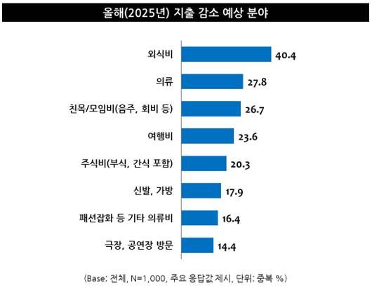 이에 올해(2025년)는 외식비(40.4%, 중복응답), 의류(27.8%), 친목/모임비(26.7%) 등 상대적으로 가계 재정에서 우선순위가 낮은 항목부터 지출을 줄이고자 하는 모습을 살펴볼 수 있었는데, 이는 경제적 부담이 증가하면서 상대적으로 조정이 가능한 항목에서 소비를 줄이려는 전략으로 풀이된다.