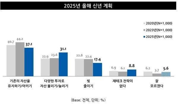 아울러 2025년에는 기존의 자산을 유지(44.2%(2023) → 37.1%(2025))하는 전략을 우선적으로 고려하고 있지만, 투자를 통한 자산 증식(23.6%(2023) → 31.1%(2025))을 계획하고 있는 비율 소폭 증가한 만큼, 경기 침체 상황 속 투자 행보를 계획하는 사람들이 많아질 것으로 예상된다.