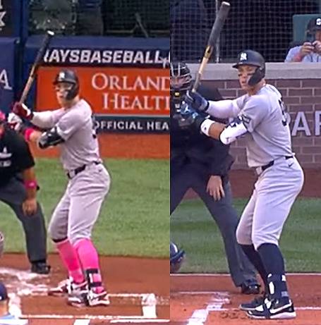 지난 시즌 초반 저지는 오픈 스탠스를 취했다. 앞발을 조금 열어뒀다(왼쪽). 그런데 올해는 두 발이 거의 평행을 이루는 스퀘어 스탠스를 취하고 있다(오른쪽).