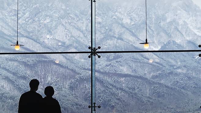 통유리창으로 길게 뻗은 구조 덕분에 어느 자리에 앉아도 울산바위가 한눈에 들어옵니다.