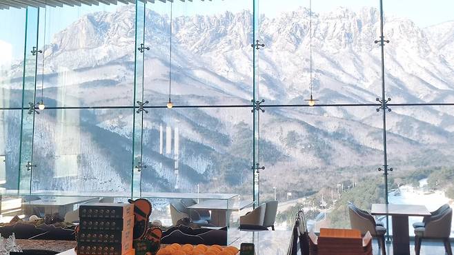 소노펠리체 델피노 리조트 EAST동 10층, 미시령 고개 인근에 자리한 '더 엠브로시아'는 설악산 울산바위를 마주 보며 여유롭게 커피 한 잔을 즐길 수 있는 절경 카페입니다.