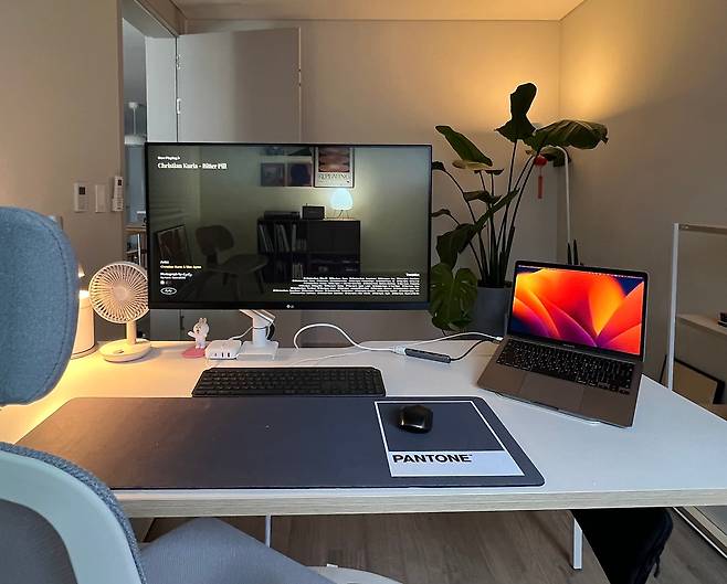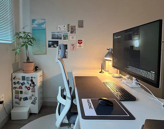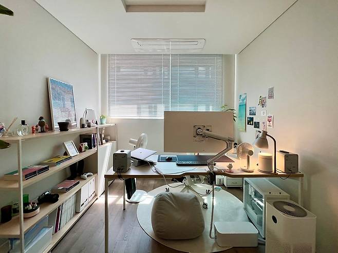 저희 집 서재의 컨셉은 '사무실'입니다. 거실에 있던 식물도 방 안으로 옮기고 재택근무하기에 좋은 환경을 만드는데 집중했어요. 침실과는 다르게 창문에 커튼이 아닌 블라인드를 달아주기도 했습니다.