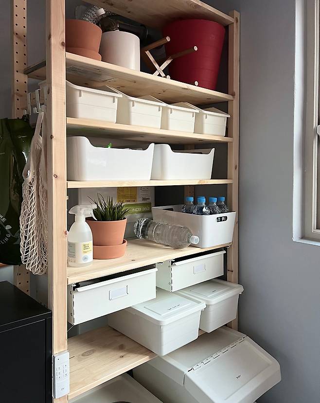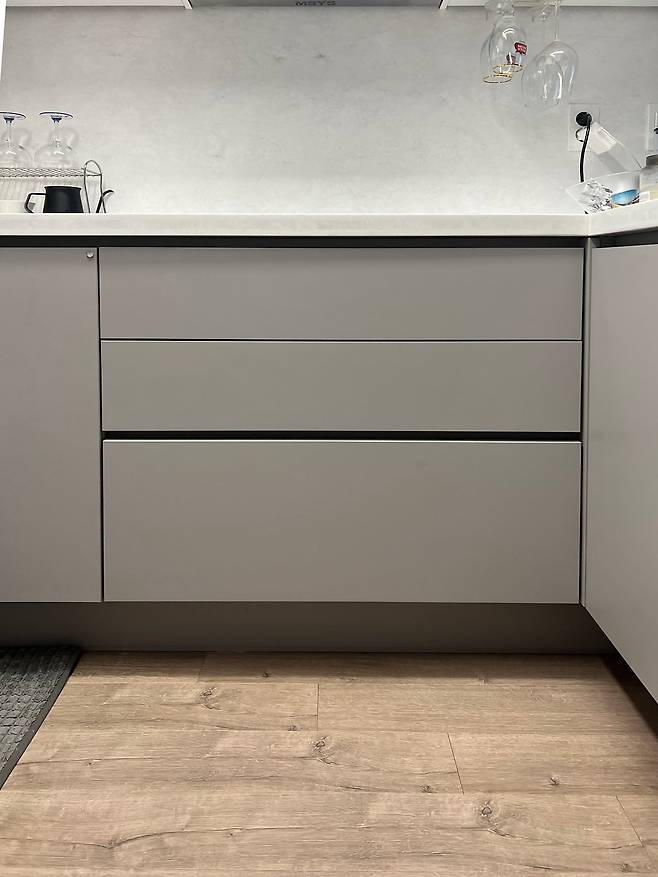 이 집에서 머문 2년 사이 주방에 있었던 가장 큰 변화는 식기세척기를 설치한 거예요. 덕분에 주방 수납공간이 많이 줄어 아쉬웠지만, 베란다에 수납장을 만들어 해결했습니다.