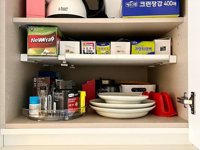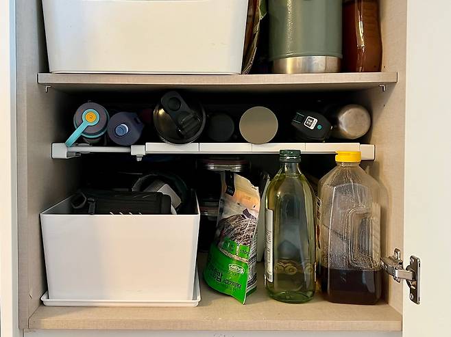 또 주방의 물건을 알차게 수납하기 위해 '압축봉'을 아주 잘 사용했는데요. 높은 선반의 위 공간까지 알차게 쓰려고 설치했더니, 물건을 꺼내기가 훨씬 수월해졌습니다. 사진에 보이는 것처럼 약들도 회전판 위에 올려두어 쉽게 쓸 수 있도록 했습니다. 텀블러 병도 세워두면 뒤편에 손이 닿지 않아 힘들었는데, 사진처럼 한 줄로 눕혀두니 좋더라고요.