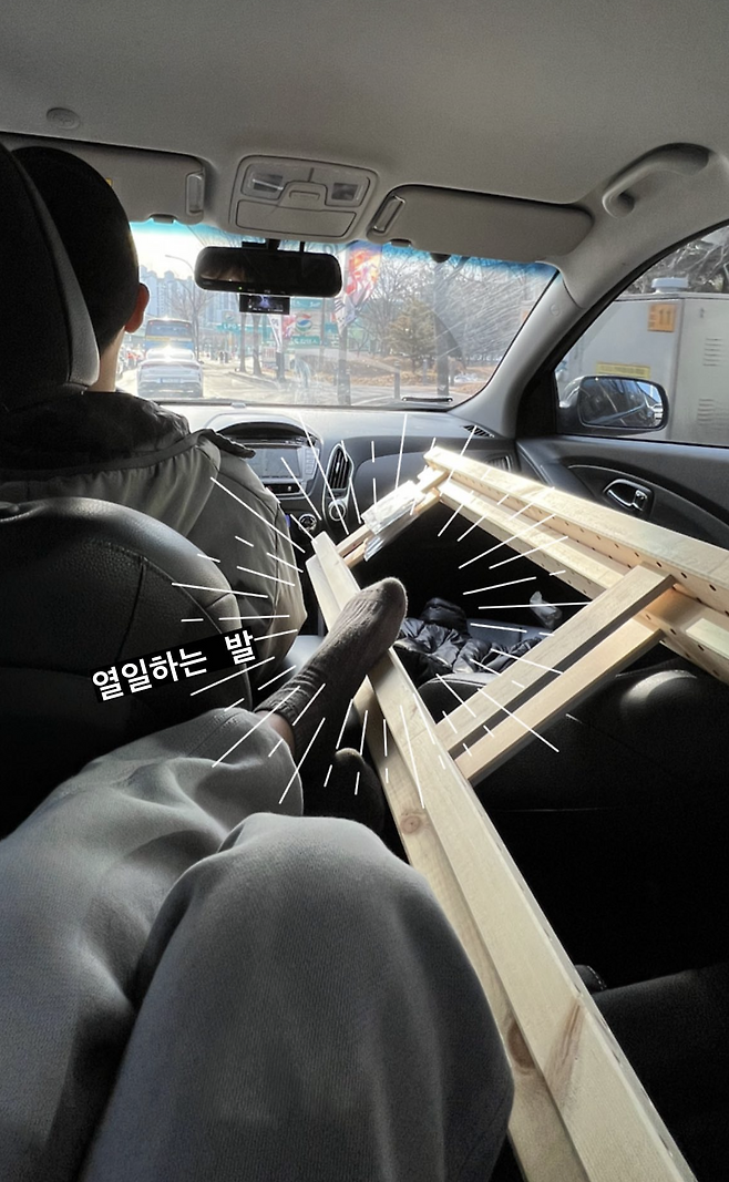 집에 있는 많은 가구를 남편이 직접 DIY로 제작했는데, 여기엔 재미있는 에피소드도 있었어요. 남편이 팬트리를 직접 DIY로 설치하려고 이케아에서 부품을 구매해왔는데, 선반 높이 때문에 차 앞좌석에서 트렁크까지 길게 늘어뜨려서 실어 오게 되었거든요. 사진처럼 몸을 뉘고, 받치고 우여곡절이 많아서 참 웃겼던 기억이 납니다. 하지만 그 이후로 무거운 가구는 그냥 배송 서비스를 이용하고 있어요.