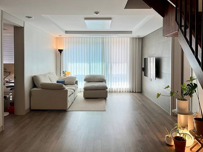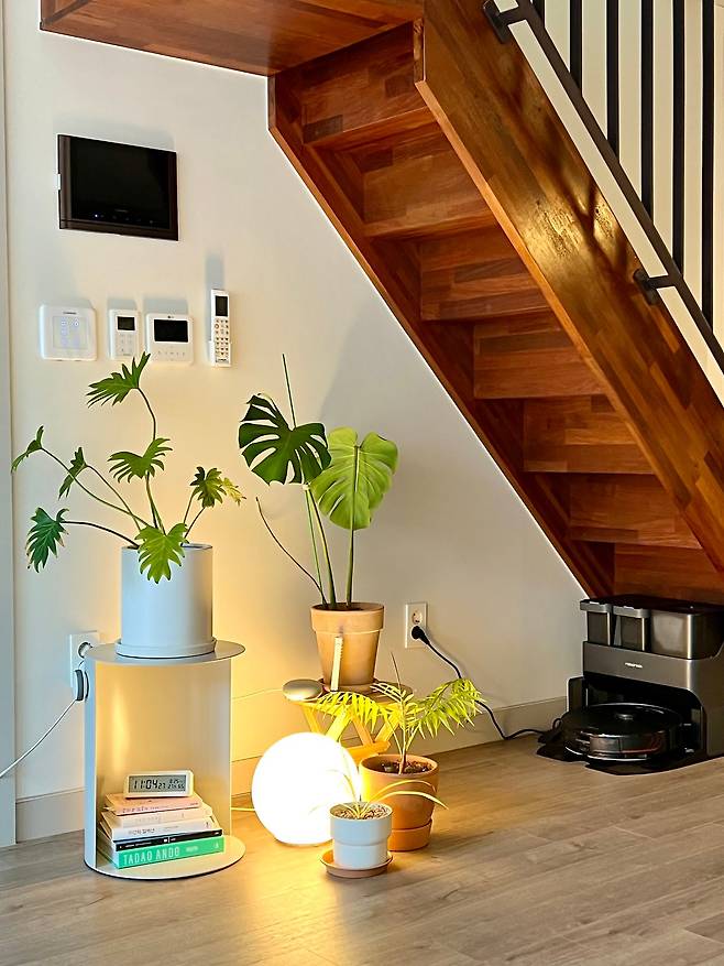 거실의 특별한 풍경이라면 복층으로 이어지는 계단이 보인다는 거예요. 활용이 어려운 계단 아래 공간은 인테리어를 위한 전시 공간으로 사용하고 있는데요. 제일 안쪽에 청소기를 수납하고, 그 앞에 식물과 조명을 두어 밝고 싱그러운 느낌을 줄 수 있도록 했습니다.