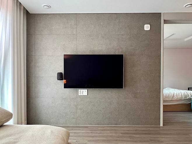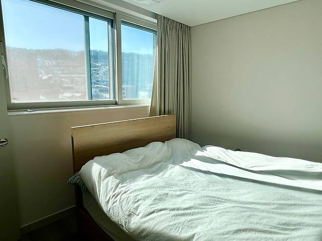 저희는 침실에서 가전제품을 모두 빼고 사용하고 있어요. TV를 보고 싶거나 음악을 듣고 싶은 사람은 거실에서 쉬고, 아프거나 컨디션이 좋지 않은 사람은 침대에서 편히 잘 수 있도록이요. 최대한 안락한 분위기를 위해 침실 커튼은 암막 커튼으로 달아주었습니다.