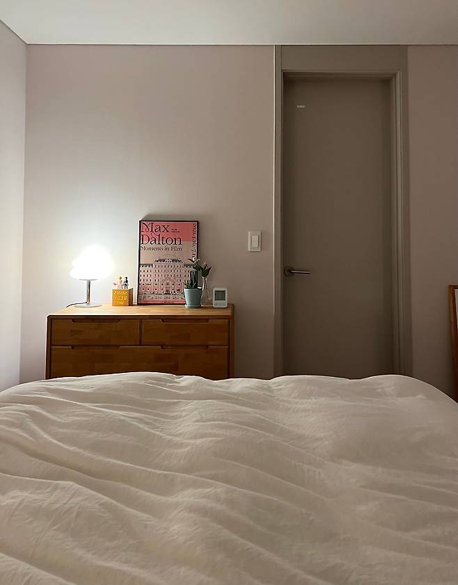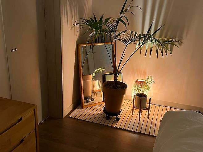 침실의 컨셉은 '휴양지'입니다. 잠만 자는 공간으로 꾸미려고 침대만 두었더니 어쩐지 삭막하게 느껴지더라고요. 그래서 아늑한 느낌을 더해줄 우드 서랍장과 식물을 한편에 두었습니다.