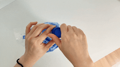 입구 부분을 설탕 비닐로 감싼 다음 OOO을 활용해 단단하게 고정해 줍니다. 비닐 부분을 잡아 밖으로 한번 접어 주면 페트병 입구와 분리되지 않고 더 단단히 고정할 수 있어요.