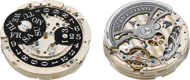 이 시계가 크로노그래프임을 떠올린다면 석연치 않은 부분을 발견할 수 있습니다. 크로노그래프를 작동하는 푸시 버튼이 따로 보이지 않는다는 겁니다. 케이스 측면에 있는 두 개의 푸시 버튼은 각각 날짜(2시)과 요일(4시) 조정을 담당합니다. 물론 반대편에서도 버튼은 찾을 수 없습니다. 트릭은 크라운에 숨어 있습니다. 랑에 운트 죄네는 오디세우스의 디자인을 유지하기 위해 푸시 버튼에 크로노그래프 스타트/스톱과 리셋 버튼을 통합했습니다. 스크루 다운 크라운이 잠겨있거나 푼 상태에서 버튼을 누르면 크로노그래프를 작동할 수 있습니다. 크라운을 한 칸 당긴 상태에서는 요일과 날짜를 바꿀 수 있습니다. 크라운을 끝까지 당기면 초침이 멈추고 시간을 조정할 수 있습니다. 크로노그래프가 작동하는 상태에서 요일과 날짜를 조정해도 상관없습니다. 크로노그래프와 캘린더 메커니즘이 완전히 분리되어 있기 때문에 사용자는 부담 없이 시계를 조작할 수 있습니다. 버튼을 눌러 크라운 포지션을 바꾸는 시계는 있습니다만 크라운 포지션으로 메커니즘을 변환하는 것은 기발하고 생소한 발상입니다.