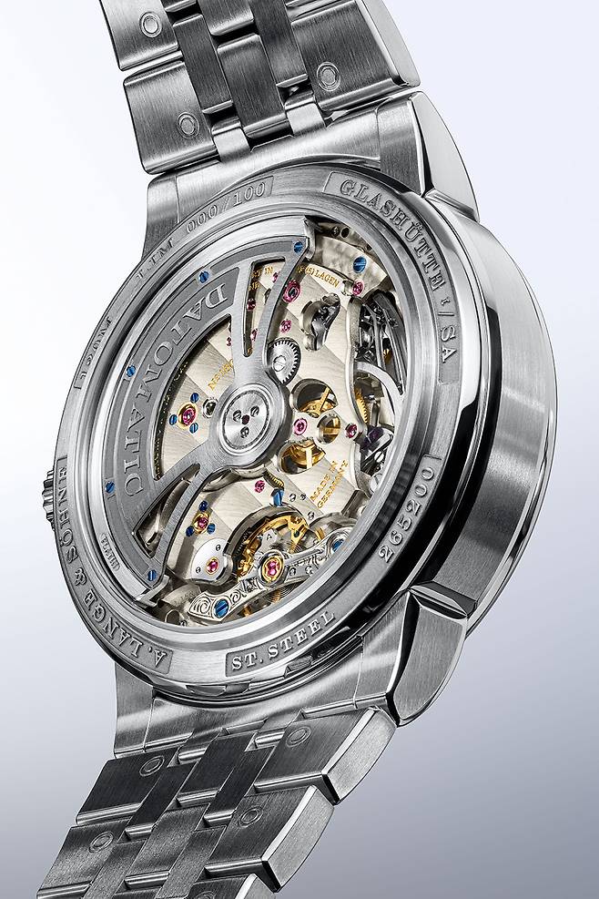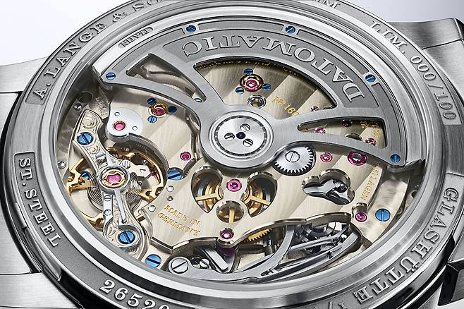 1994년 부활 이후 71번째로 개발된 매뉴팩처 셀프와인딩 칼리버 L156.1은 브랜드 최초의 셀프와인딩 무브먼트입니다. 부품 수는 516개에 달합니다. 수작업으로 인그레이빙한 밸런스 브리지, 와인딩 효율을 높이기 위해 플래티넘 추를 부착한 스켈레톤 로터는 오디세우스를 위한 다토매틱 칼리버 L155.1에서 비롯했습니다. 저먼 실버 플레이트, 블루 스크루, 골드 샤통, 스완넥 레귤레이터 등 글라슈테 양식을 충실히 따릅니다. 블랙 폴리싱, 글라슈테 리빙(Glashütte Ribbing), 페를라주 등 아름다운 장식도 충분히 감상할 수 있습니다. 시간당 진동수는 28,800vph(4Hz), 파워리저브는 50시간입니다. 칼리버 L156.1는 그간 캐링암 방식의 수평 클러치를 고수해온 랑에 운트 죄네가 처음으로 버티컬 클러치를 도입한 크로노그래프 무브먼트이기도 합니다. 카운터가 없는 디자인에 크로노그래프 분침과 초침을 같은 축에 연결한 구조여서 버티컬 클러치를 택한 것으로 보입니다. 평소에는 초침이 연결된 세컨드 휠과 크로노그래프 휠이 떨어져 있다가 크로노그래프를 작동하면 두 톱니바퀴가 맞닿아 회전을 하는 게 버티컬 클러치의 기본 원리입니다. 집게 같이 생긴 레버가 톱니바퀴 사이를 비집고 들어가 둘을 붙였다 떨어뜨립니다. 하지만 랑에 운트 죄네의 버티컬 클러치는 조금 다릅니다. 매뉴팩처 디렉터 티노 보브(Tino Bobe)에 의하면 스프링 같은 레버를 이용해 휠을 완전히 들어올려 분리시키는데 일반적인 크로노그래프보다 부드럽게 부품을 조작할 수 있다고 합니다.