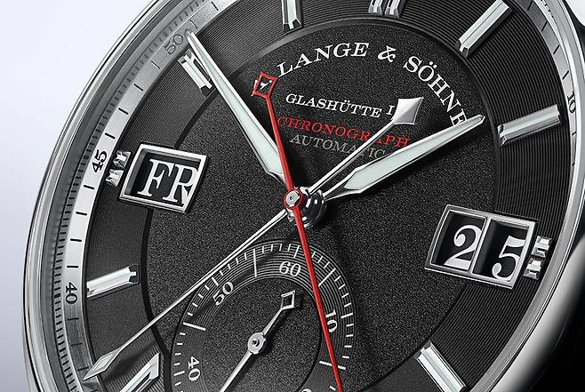다이얼에 입체감을 주입하는 방식은 2019년에 출시한 최초의 오디세우스 스테인리스 스틸 모델과 동일합니다(오디세우스는 케이스 소재에 따라 다이얼 디자인이 상이합니다). 오디세우스 크로노그래프는 아워 인덱스가 있는 외곽에는 얇은 홈을 원을 따라 집어 넣었고, 중심부는 미세한 사포 같은 질감을 살렸습니다. 끝으로 스몰 세컨즈는 다시 한 번 층을 나눠 입체감을 극대화합니다. 블랙 다이얼 가장 자리에는 빨간색으로 포인트를 준 미닛 트랙과 크로노그래프 초 시간을 확인할 수 있는 인덱스가 자리합니다. 검은색 다이얼에는 랑에 운트 죄네, 글라슈테에서 생산됐음을 상기시키는 문구와 함께 붉은색 글씨로 크로노그래프를 적었습니다. 오디세우스 컬렉션이 공유하는 랜싯(Lancet) 시침과 분침을 비롯해 초침 끝에도 슈퍼루미노바를 칠했습니다. 3시 방향의 빅데이트와 맞은편의 날짜 창도 제 자리를 지키고 있습니다. 크로노그래프 동작을 수행하는 다이얼 중앙의 흰색 크로노그래프 분침과 빨간색 크로노그래프 초침은 포개어져 있습니다. 별도의 카운터 없이 크로노그래프 바늘을 중앙 축에 꽂아 시간을 측정하는 것은 오디세우스 고유의 디자인을 훼손하지 않기 위함입니다.