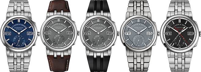 5열 스테인리스 스틸 브레이슬릿은 최고 수준의 마감을 보여줍니다. 부드럽게 다듬은 뒤 광을 낸 모서리를 제외한 나머지 부분은 모두 브러시드 처리했습니다. 안쪽 면에 설치된 작은 구멍을 전용 핀으로 누르면 손쉽게 링크를 분리할 수 있습니다. 버클 양쪽의 버튼을 누르면 버클이 열립니다. 랑에 운트 죄네가 각인된 동그란 버튼을 누르면 최대 7mm까지 브레이슬릿 길이를 조절할 수 있습니다.