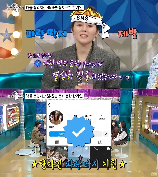 한가인은 지난 1월 MBC '라디오스타'에 출연해 '파란 딱지'가 탐난다고 공개적으로 욕심을 드러낸 바 있습니다. SNS에서 유명인의 계정임을 인증하는 파란색 공식 인증마크를 뜻하는 것이었는데요.