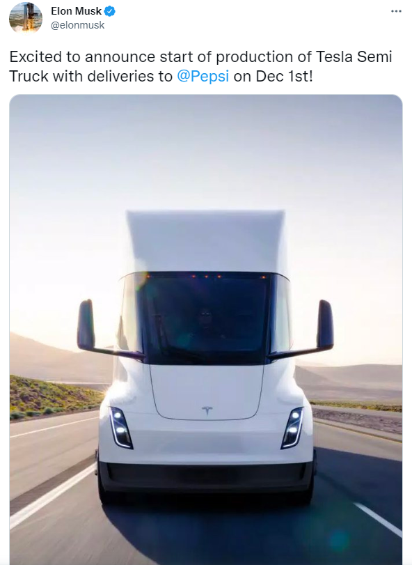 일론 머스크에 따르면 세미트럭의 생산을 마침내 시작했으며, 출고는 오는 12월 1일부터 시작한다. 가장 처음 세미트럭이 출고될 곳은 바로 펩시이다.