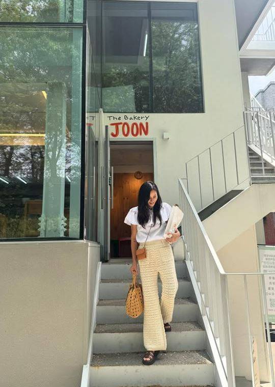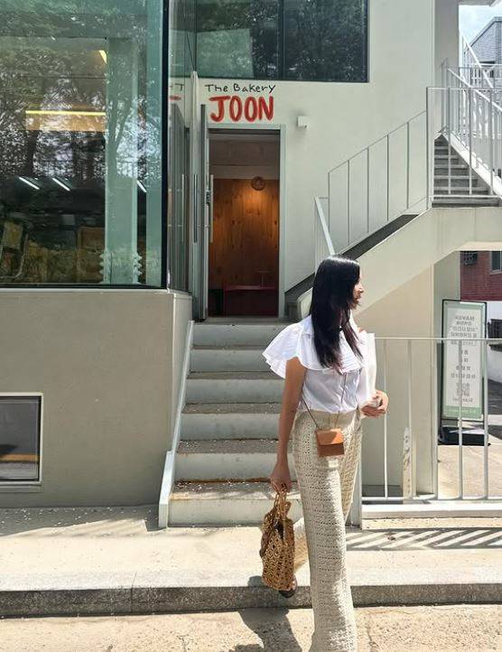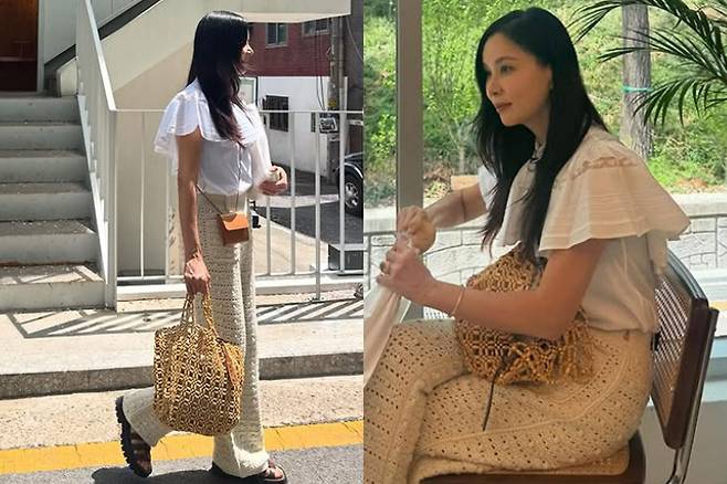 공개된 사진 속 고소영은 하얀 프릴 셔츠에 구멍이 뚫린 베이지색 바지로 청순한 듯 힙한 분위기를 자아내는 스타일링을 완성했습니다.